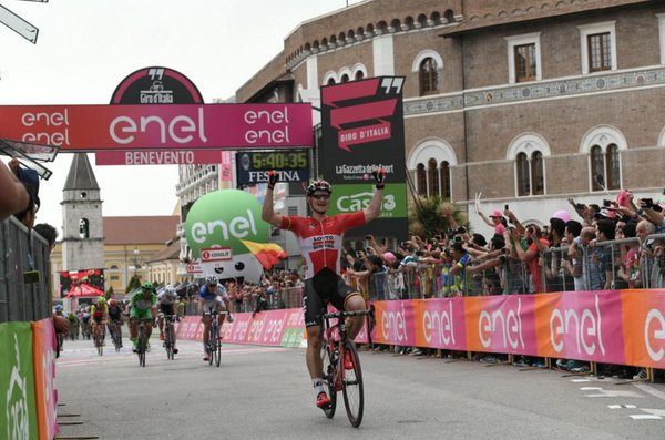 È il tedesco André Greipel (NELLA FOTO IN ALTO SODDISFATTO ALL'ARRIVO) il vincitore della quinta tappa della corsa rosa con arrivo a Benevento. Il corridore della Lotto-Soudal ha preceduto sul traguardo con un capolavoro di tattica e di potenza il francese Demare e Sonny Colbrelli. Per lui è il terzo successo in carriera al Giro d'Italia. Ancora in maglia rosa l'olandese della Giant Alpecin Tom Dumoulin. Un'altra affermazione tedesca al Giro dopo il bis nei giorni scorsi di Marcel Kittel, rimasto staccato quest'oggi ben prima dello sprint. Successo dunque per distacco per il "gorilla", abile a interpretare meglio di chiunque altro l'insidioso rettilineo d'arrivo in porfido aprendo il gas a trecento metri dal traguardo. Una volata, quella finale, caratterizzata da una scivolata di Taaramae a un km dall'arrivo che ha compromesso le possibilità di alcuni corridori, tra cui Modolo, di chiudere al meglio la frazione.